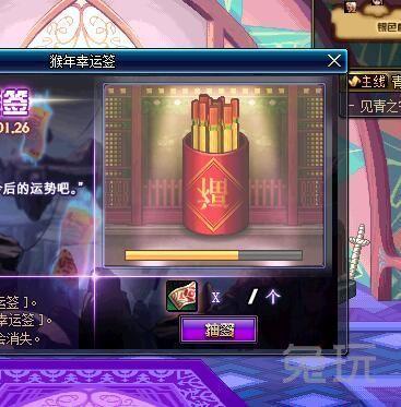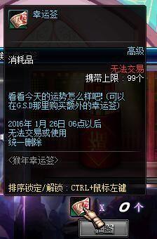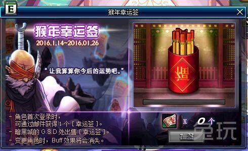 1月14日DNF新活动:猴年幸运签,每天登录游戏都会获得一个幸运签,然后就能抽签了,在GSD那里还能买幸运签,签到上上签BUFF更给力。