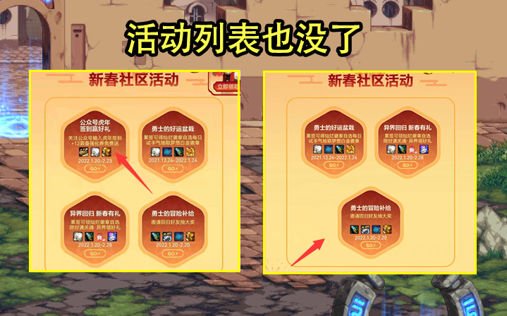 面对这么给力的活动,几乎所有玩家都会参与,然而,就在1月20日新春版本开启之后,却有玩家意外发现虎年签到活动突然下架了,连活动介绍也少了这个活动,这不免让人感到很吃惊,难道说策划送不起12强化器券吗?不可否认,网页活动送12强化券还是13年来第一次,一般来说都是以灿烂自选徽章作为收尾奖励,但是仔细想想,强化110版本强化12前不掉,新春版本赠送一个破烂+12强化券也没什么奇怪的。