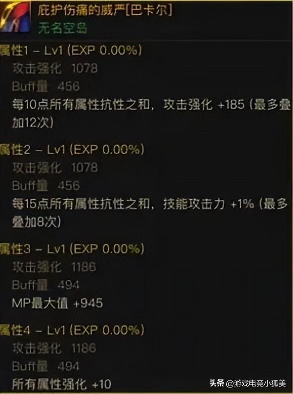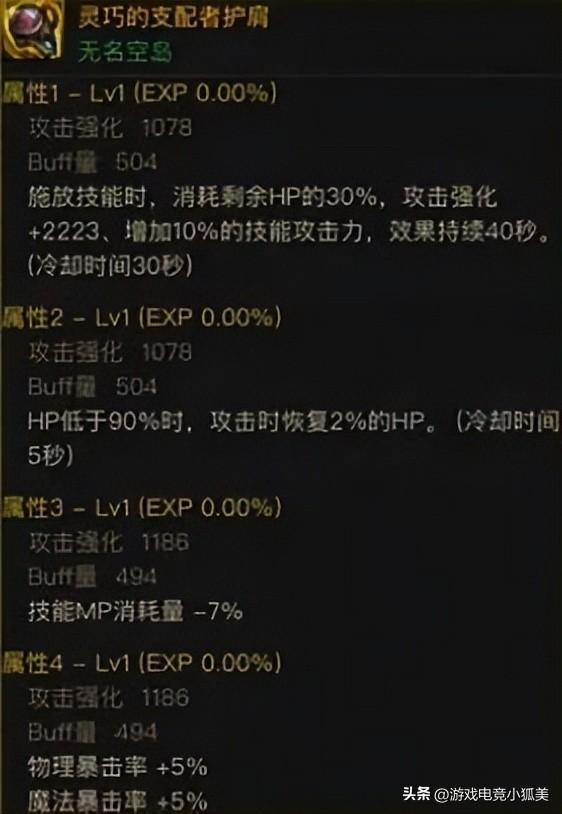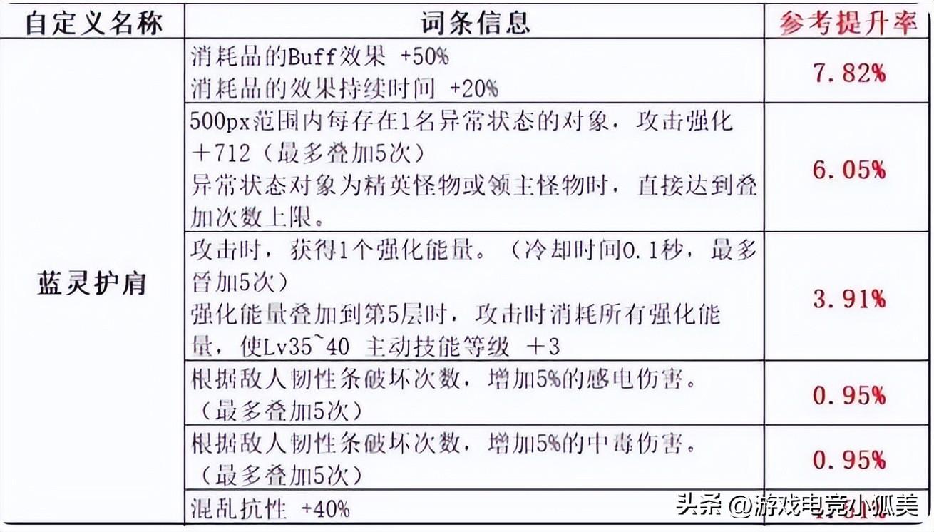 第一件、蓝灵护肩, 核心词条是BUFF药剂+50%,所以也称作是药王护肩。是修炼场一哥,实战强度也不俗。完美词条是消耗品的Buff效果+50%,每存在1名异常状态的对象,攻击强化+712,最多叠加5次,单次条15属强,全属强15属强。