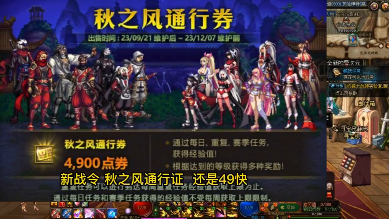 ·新战令秋之风通行证还是49块,奖励没有太多的变化,只是少了一个光环。策划怕有了这个战令光环就不买金秋礼包了,格局小了。自选龙袍属性,宠物稀有天空加10增强券,黄金合成器等核心道具,还是在的可以考虑入手。