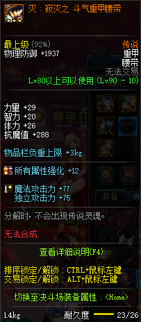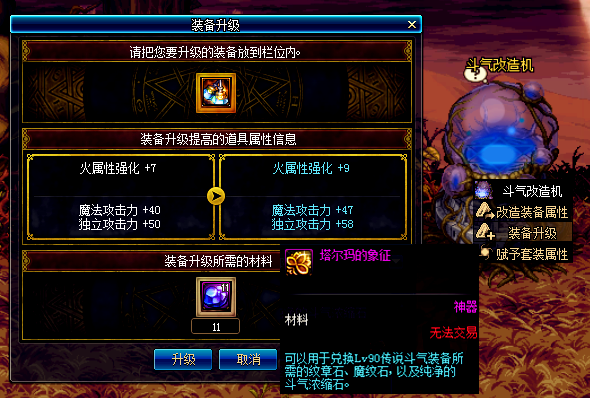 如果对装备的属性不满意可以使用斗气改造机进行装备属性改造,改造装备属性所需的材料也是使用特尔玛的象征在NPC休亚的商店中1比1兑换的。需要注意的是:装备属性不能转换成其他类型的,只能在本类型中改造属性,目前已知的装备属性类型有三种。