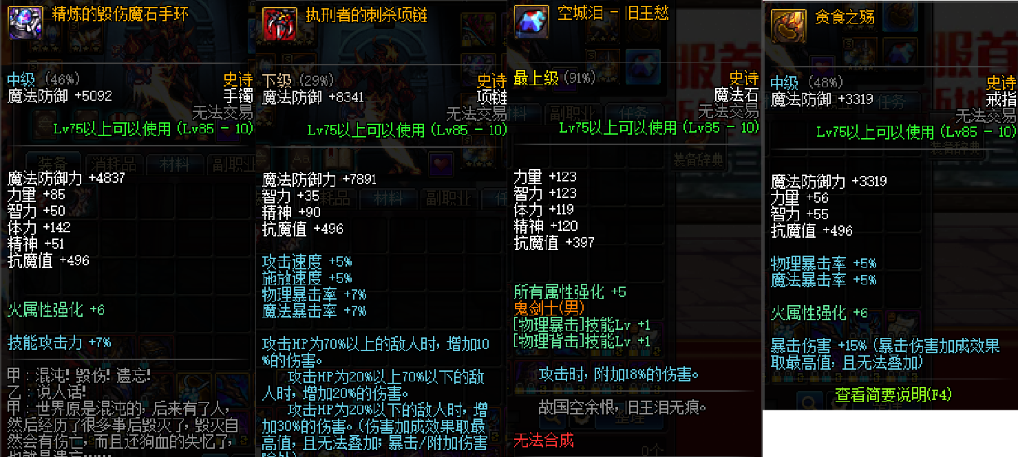 史诗首饰是这四个,都不算非常强的散件史诗,而且都没有90的史诗,如果大家有这些好的首饰,伤害那么就更高了,而且平民附魔至少是10的属强,我这里才6点。艾肯套非常需要黄暴,所以如果周年庆给了三贪食,搭配艾肯是非常搭的!