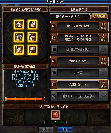 单件属性选择独立和属强,大家先把属性做出来再升级,这样材料消耗少