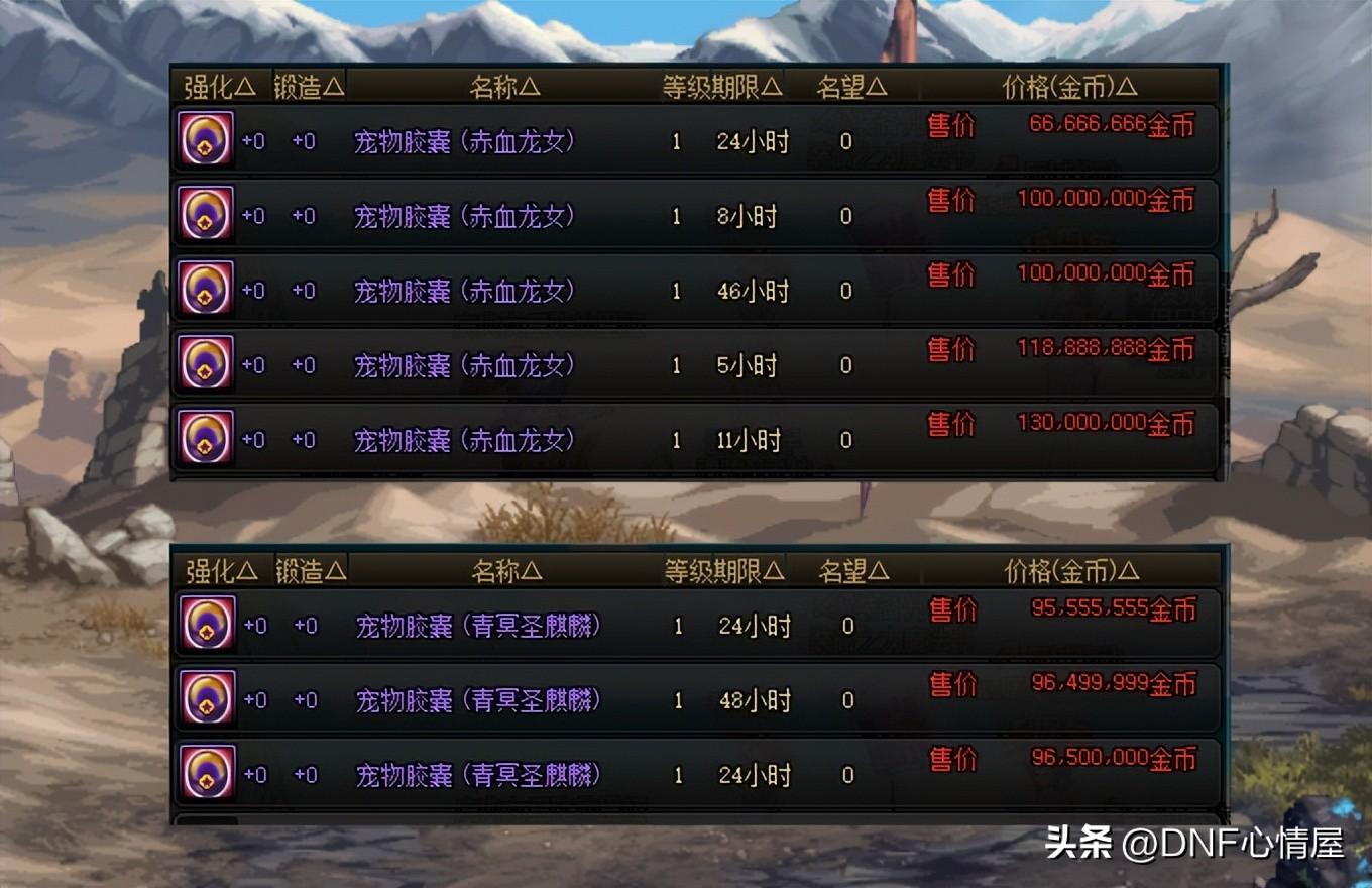 不过非联动宠物,在价格方面上,就不是那么昂贵了,但同样值得封印。麒麟、龙女等等,这些往期的节日宠物,买个宠物胶囊价值五六千万,封印卖了1亿左右,还是可以赚一点的!