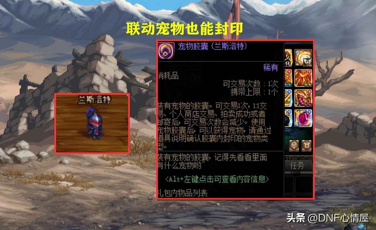 由于不知道,这是BUG,还是策划进行了调整,对有绝版联动宠物的玩家,抓紧时间买胶囊封印。毕竟一旦后面,策划给修复了,无法进行封印,那损失就比较大了!可惜的是,“宠物封印胶囊”,这个道具商城中,每个账号仅限买一次,对于有多个联动绝版宠物的玩家来说,是没有办法全部卖掉的。