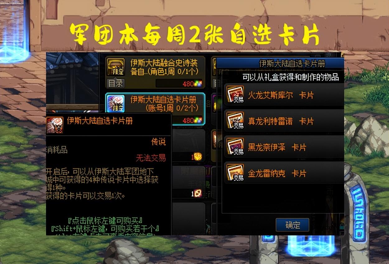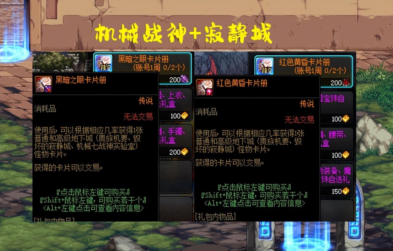 每周都可以在寂静城、机械战神、以及军团商店兑换2个传说卡册,其中“寂静城”和“机械战神”的4个卡册是随机的,只有开到传说卡片才比较值钱,如果大家留心观察就会发现,每周四的传说卡片都尤其便宜,因为这一天正好是更新兑换次数的日子。