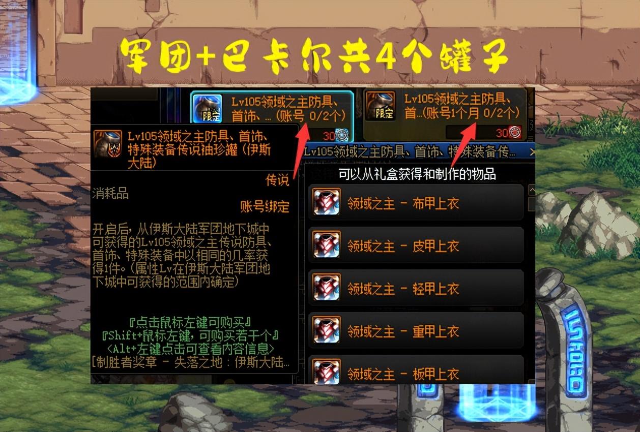 首先是军团本和巴卡尔/巴卡妮副本的光迹商店,在商店兑换中,可以用30个材料兑换1个领域之主(随机传说装备),军团本每月可兑换2个,巴卡尔每月也可以兑换2个,总计就可以兑换4个传说罐子。