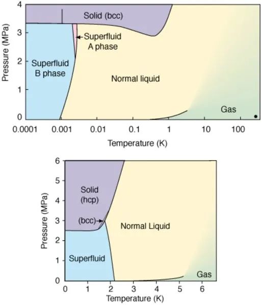 氦三(上图)与氦四(下图)的压强-温度相图。氦三的相变温度非常低,为展现出特征,温度使用对数标尺。注意两图在温度区间上的巨大差别。| 图片源自[4]