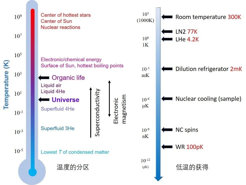 随着科技的进步,在我们日常生活中已经有了可以时刻保持低温的容器了,没错,我说的正是冰箱(笑),虽然其在日常生活中已经能够满足我们大部分生活需要,但是在物理学中这种温度还远远不够低 。在物理学中所说的低温一般是指在液氮温度 (77K ,K表示开尔文温度,开尔文温度数值上等于摄氏温度数值减去273.15)以下的温度区间,而与动漫中追求冰系魔法的更强破坏性不同的是,在物理学中,物理学家们朝着另外的魔法极限去努力,就是不断突破更低的温度 。