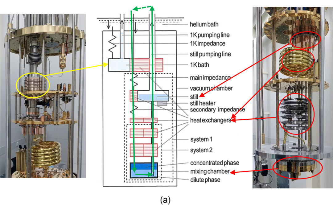 图(a) 稀释制冷机结构示意图及实物图 | 示意源自[1]
