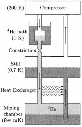 我们知道氦(He)是一种稀有气体,它的化学性质非常稳定,一般在自然界中以单质存在,它有两种同位素,He和He,当温度高于0.87K时,两种溶液能够以任意比例互溶,而当温度低于0.87K时,混合液会分离成两种相 ,其中He较多的相称为浓缩相,He较少的相称为稀释相,并且在浓缩相中的He具有比稀释相中小得多的焓和熵(这是两个与系统热力学性质有关的物理量,其增加伴随着吸热过程),当从稀释相中不断抽走He时,为了保持新的平衡,浓缩相的He会跑到稀释相中导致熵增,这样就会吸热引起系统温度的降低 。