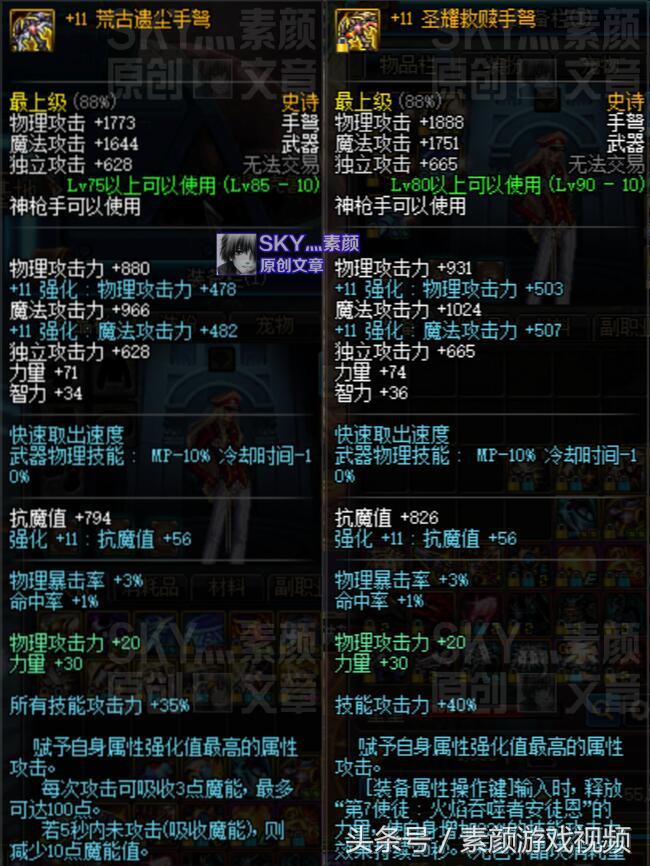 除了技能攻击力部分的提升外,圣耀救赎武器的等级为 90 级, 而荒古遗尘武器的等级为85级,在基础攻击力方面,荒古升级到圣耀也是会获得提升的。 以我的圣耀救赎手弩为例(走物理),圣耀手弩比荒古手弩多出了51点物理攻击力;以强化+11为例,在强化部分的物攻上,圣耀手弩比荒古手弩多出了25点;总的来说,在武器强化+11时,荒古手弩升级到圣耀手弩,总共可获得 76 点物攻的提升,提升率约为 4% 。 当然,在武器类型不同、强化等级不同时,升级增加的基础攻击力数值也是不同的, 这里为了便于分析,便用我弹药的手弩为例了。