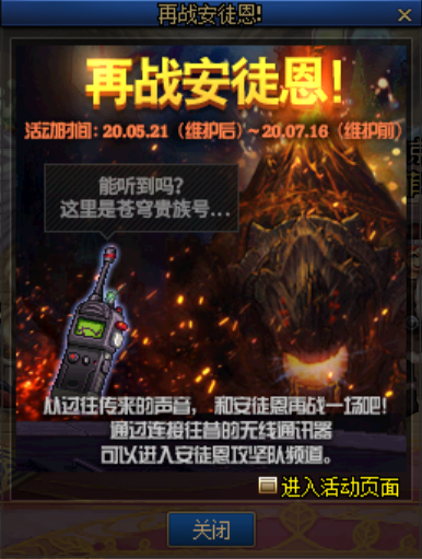 活动期间开放安徒恩攻坚战,20人团本,难度简单,门票3个精炼或者30个堇青石,每周2次。通关一阶段队伍翻牌获得5个安徒恩魔能结晶,阻截成功攻坚队翻牌获得30以上的引导石,金牌50个;