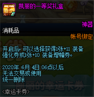 凯丽的是三等奖+9强化券或者+9增幅券,二等奖+1级,一等奖再加1级,也就是11强化券或者+10增幅券。