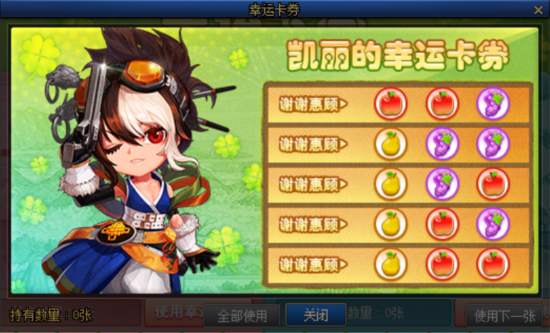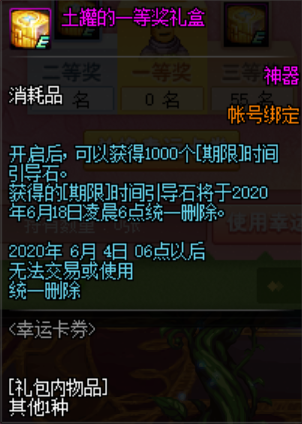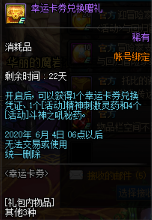 获得一个幸运卡券兑换赠礼,打开获得卡券兑换凭证和药水。凭证可以在活动商店兑换奖励。
