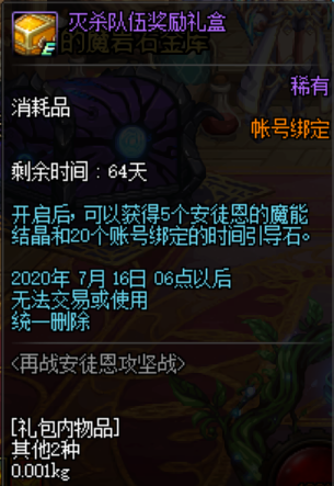 二阶段队伍翻牌获得灭杀安徒恩礼盒,打开获得5个魔能结晶和20个引导石。灭杀成功攻坚队翻牌获得30个以上引导石,金牌获得随机的100级史诗武器。