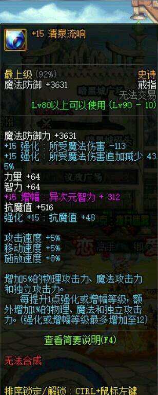 你们还别说,增幅15的清泉流响,我是真的没有见过,足足加了312点智力,而且有百分之15的双攻和独立加成,我才这个天帝玩家一定爽死了,一件装备顶上了我整个右边的装备。