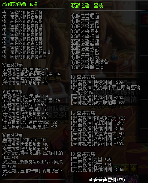 这两套差别是在九件套上,寂静之誓可以增加荣誉祝福的效果要比二期的高一些,所以奶爸们又将这两套成为大寂静和小寂静,还有选择寂静之誓6件套搭配寂静的祈祷3件套来提升武器祝福和天使辅助的6+3。