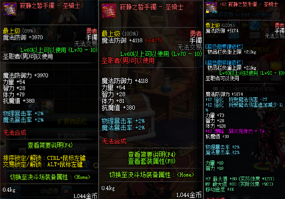 先看上面的三个图,在基础数值上,当达到100%的最上级时候,最高的体力值为81点,达到最上级拥有79点体力,虽然达到100%可以提升2点的体力,在没有很多品级调整箱的情况下,我们达到最上级即可,这是最基本的要点就是调整装备品级。最直观的说,当你兑换到最下级的头肩仅为33点体力,但是最上级则能达到40点,相差7点的体力加成。