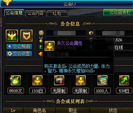 除了这些,我们还能通道工会属性加成,工会属性可以增加120点的四维(永久+限时)