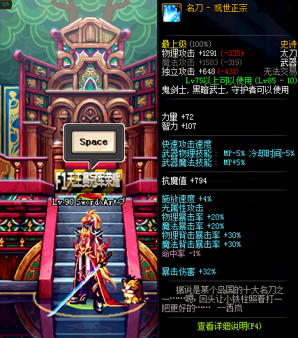 名刀-观世正宗,85级史诗太刀。半透明的刀身泛着冰冷的天蓝色,在90版本之前是鬼剑士梦寐以求的长刀,也是目前属性最好的长刀。