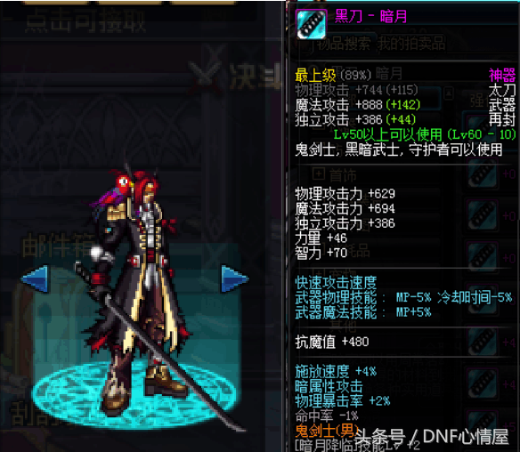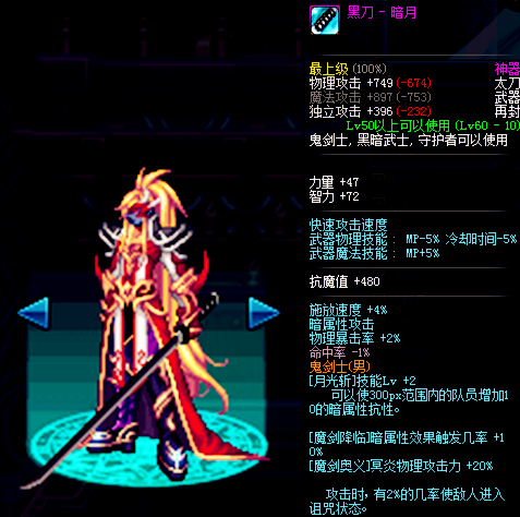 黑刀-暗月,60级神器太刀。如果说流星落是火刀,那它就是名副其实的黑刀,暗属性攻击,刀身也是黑压压一片,现在已经绝版了。