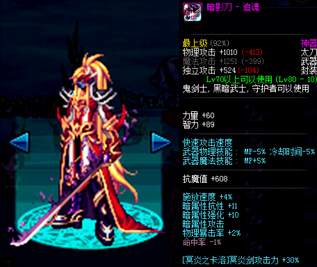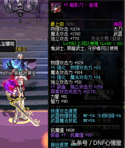 暗影刀-追魂,80级神器太刀。刀身像是被一团黑色的火焰包围,只露出刀刃,记得某次掷筛子大冒险活动过后,满大街的鬼剑士都是穿戴这把武器。