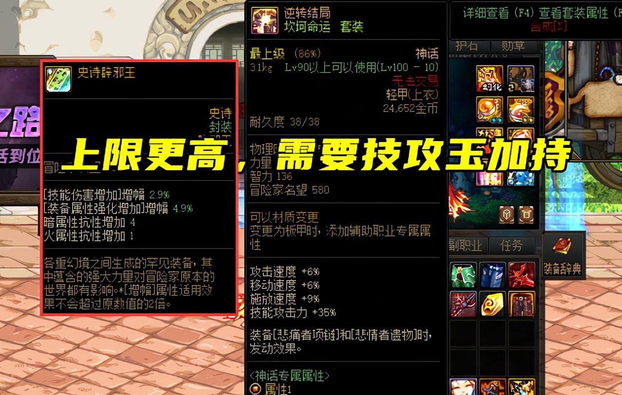 “逆转结局”优势在于属性全面,技攻词条高,理论上的上限是最高的,但由于大多数玩家不会买改造史诗,也不会买辟邪玉,其实这个“理论上限”意义不大;