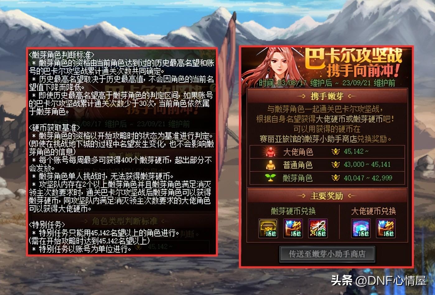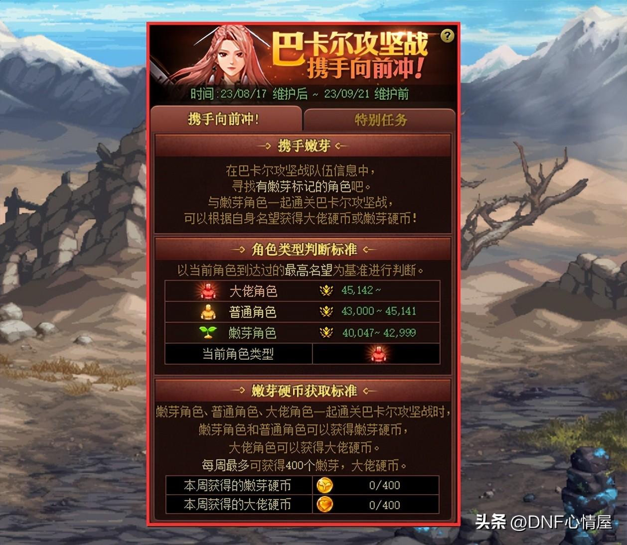 而普通角色,名望值区间43000~45141;大佬角色,名望值高于45141。当嫩芽、普通和大佬角色一起通关巴卡尔攻坚战时,嫩芽和普通角色,可以获得“嫩芽硬币”,而大佬角色,能获得“大佬硬币”。但注意了,嫩芽和大佬,最多每周能获得400个!