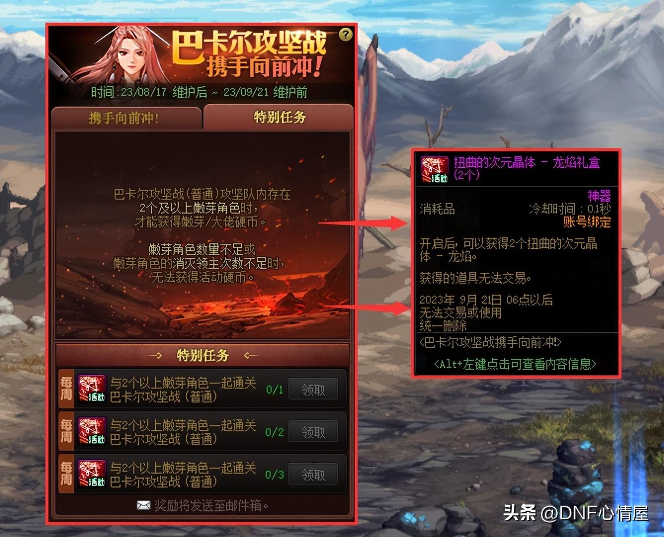 此外“老带新”活动,还存在3个特别任务,能拿3个【扭曲的次元晶体-龙焰礼盒(2个)】,这属于账号绑定形式。意味着,只要每周与2个以上的嫩芽角色,一起通关3次普通巴卡尔攻坚战时,即可获得6个账绑龙焰晶体。