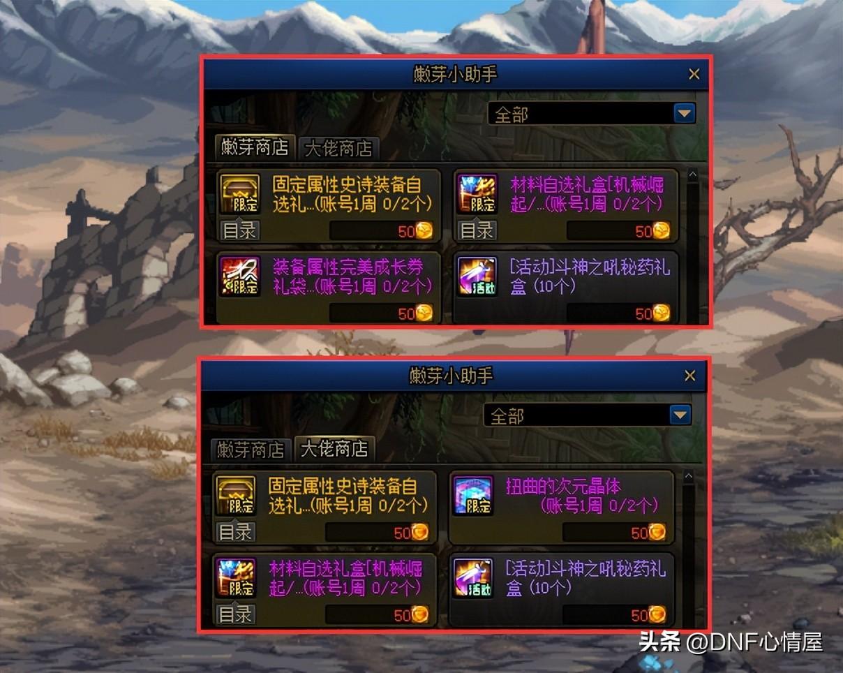 在“大佬商店”内,跟“嫩芽商店”,其实都差不多,只是没有装备属性完美成长券,换成了扭曲的次元晶体。账号每周能换2个,持续5周时间,在整个活动期间,可获得10个扭曲的次元晶体。