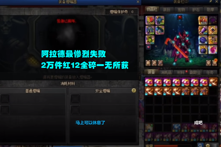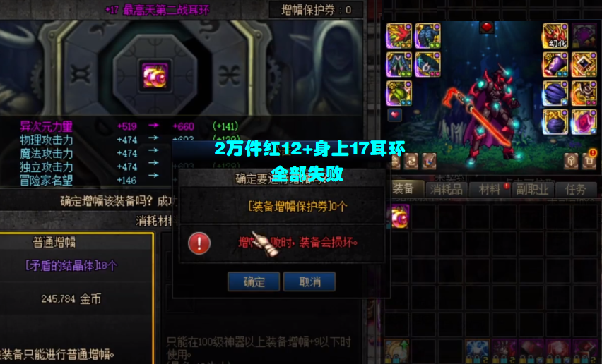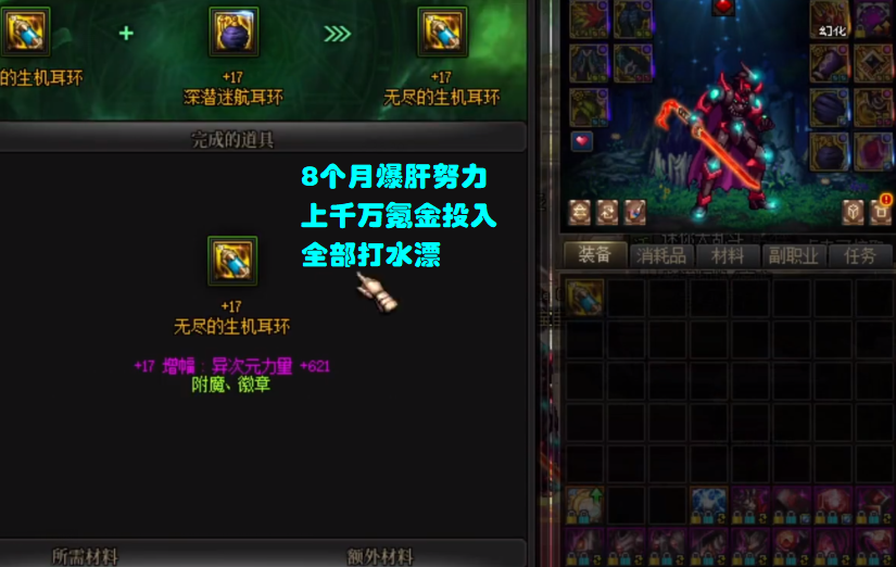 然后再说“花费”,2万件胚子,大概上了10件左右红16,7件左右红17,光是这些高增幅装备,实际成本都在1000万以上!甚至可以说,你花费1000万都未必能冲上这么多的红16和红17,然而现在,这些装备全部碎了。