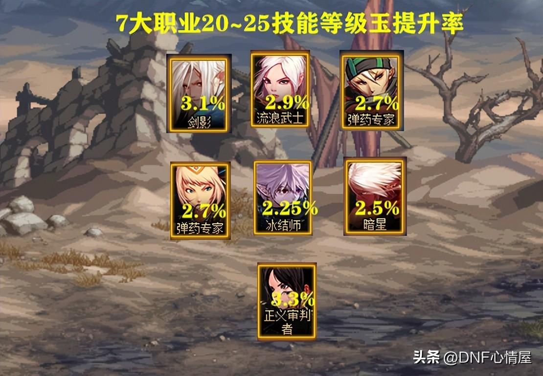 【2】20~25技能等级玉。 提升率超过2%的,存在着7大职业,分别是剑影3.1%、剑帝2.9%、男弹药2.7%、女弹药2.7%、冰结师2.25%、团长3.3%和刺客2.5%;