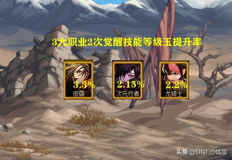 【6】2次觉醒技能等级玉。 3个职业,提升率超过2%,分别是毒王3.3%、次元行者2.15%和龙骑士2.2%。