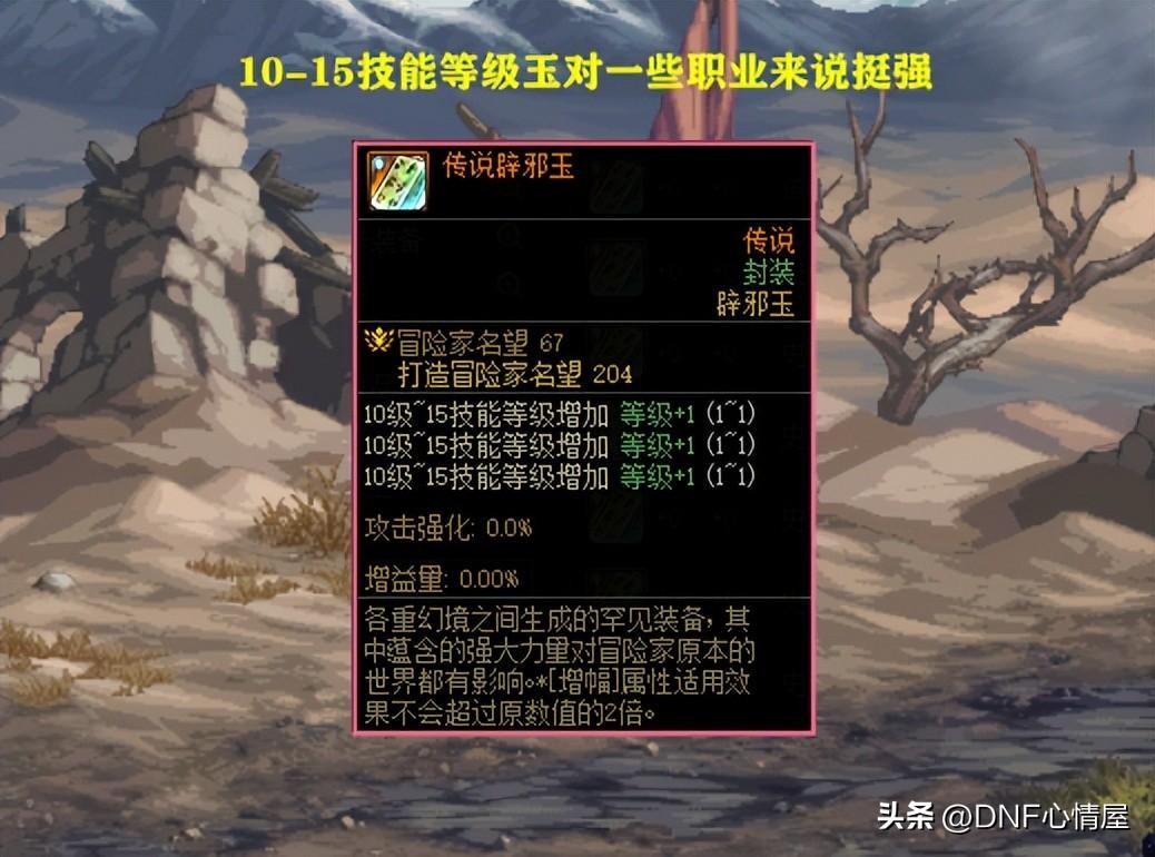 辟邪玉这个道具,提升率还是比较大的,对于输出职业来说,技攻、攻击强化和属强,在游戏中穿戴率高。但实际上,有些职业,等级玉的提升,也是非常的强。