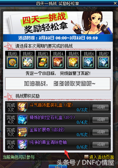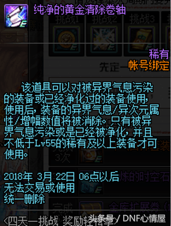 当然,纯净的黄金增幅书在拍卖行可以用远古兽人的神秘宝物礼盒随机抽取,不过这概率你懂的,肯定比较的坑,花的钱都让你心疼。不过,不要紧,在最新的活动中,也就是2月22日更新的活动的“四天一挑战”,轻松的可以拿“纯净的黄金清除卷轴”,这卷轴就比较的厉害。