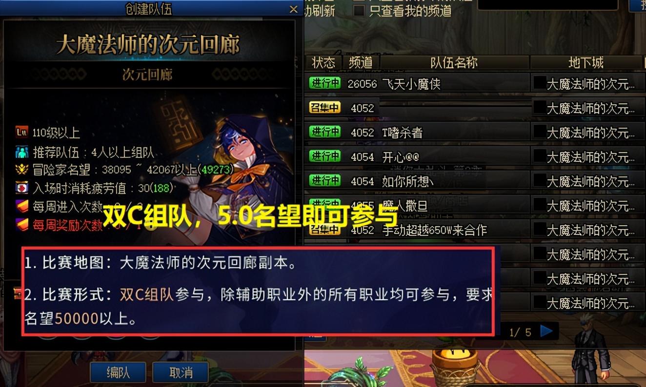 【3、比赛规定】,本次竞速副本为“次元回廊”,参与形式为“双C组队”,除奶职业玩家外均可参与,唯一的硬性要求是,名望必须在5.0以上!