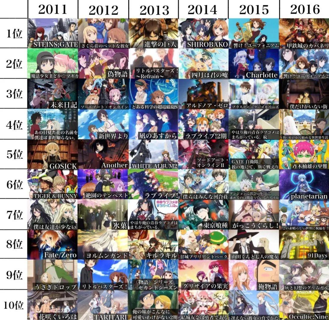 2011年:《命运石之门》《魔法少女小圆》《未来R记》《未闻花名》《哥特萝莉侦探事件簿》《基友英雄传》《我的朋友很少》《Fate/Zero》《白兔糖》《花开伊吕波》