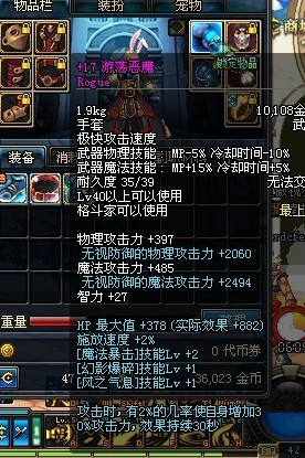 攻击有2%的几率增加30%的物理伤害,持续30秒。极快攻击速度,武器物理技能:MP-5% 冷却时间-10%,武器魔法技能:MP+15% 冷却时间+5%,耐久度 39/39,Lv40以上可以使用。在其他百分比物攻提升为15%时,游荡恶魔在触发效果并换装之后,可以带来大约26%的伤害提升率,持续时间比较理想,30秒完全足够打完一套技能。游戏币200万左右,因各区差异而定。改版后增加的HP MAX属性使其价格暴增,格斗系开场撑血必备!