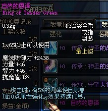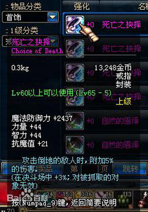 攻击时, 有5%的几率使自身增加10点属性强化, 效果持续10秒。适用职业 : 所有职业,需要等级 : 65,稀有度 : 神器,粉色。因为有艾尔文指环的存在,所以这件装备对魔法职业来说基本用不上。10点全属强的提升率因人而异,在基础属强200点,且不考虑怪物抗性的前提下,10点属强的提升率大约为2.4%。但提升还是不令人满意!