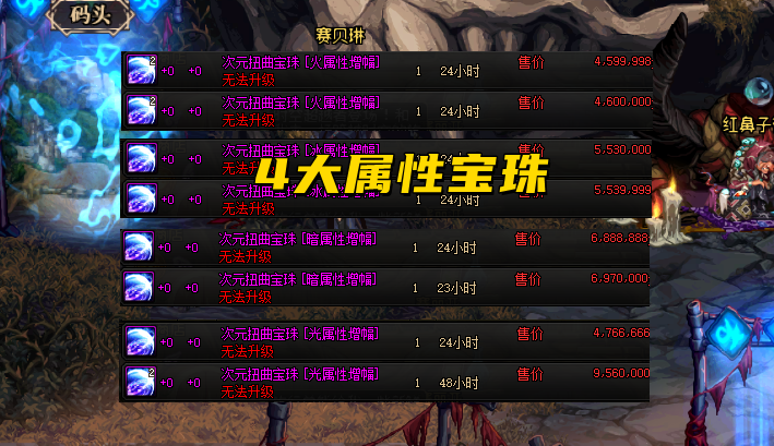 最具有代表意义的是,宠物附魔宝珠,因为只有这种宝珠,是单属性独自存在的,如果某属性售价更高,那就基本就可以代表,这是被大部分玩家所认可的。