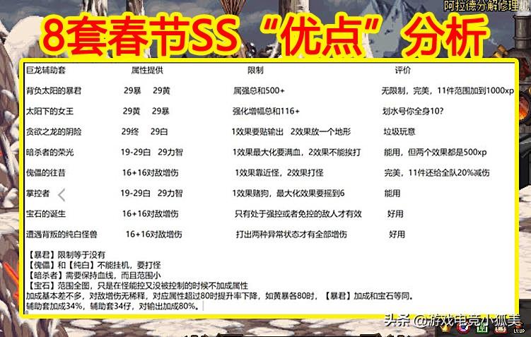 “地下城与勇士之小攻略君爱谈游戏电竞”第二千五百八十一期《DNF:8套春节SS“优点”分析,暴君和傀儡都是泛用套,堪称万金油 》,异常套属性2要求异常状态在2种以上,不是自带异常的职业仅仅靠装备和路人队友很难达到,而且这套同样上限并不高于暴君,只能说暴君的条件太简单了。老规矩搞快点,直接上本次春节史诗套的实测截图展示: