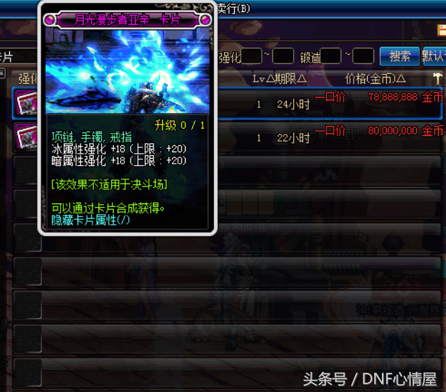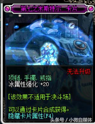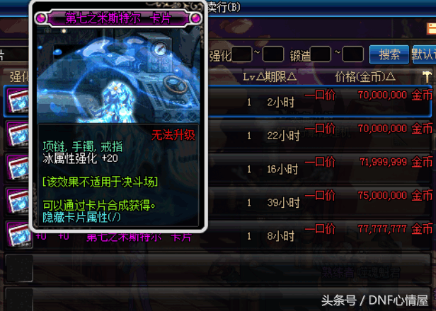 第七之米斯特尔,冰属性强化+20,冰属性职业的专属附魔卡片,这张卡片同样比较昂贵,在拍卖行也需要7000万游戏币。