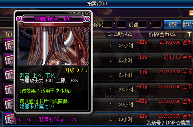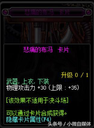 悲痛的布冯,这张卡片物理攻击+30,对应的部位是武器,上衣和下装,对于百分比职业来说,这张卡片还是挺不错的,还比较的便宜。