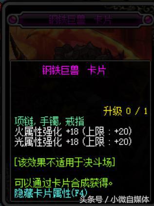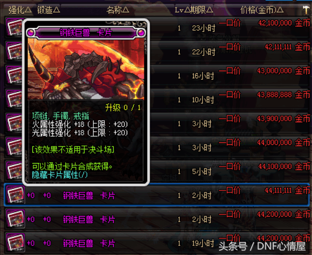 钢铁巨兽,这张卡片火光属性强化18,能升级到20属性,这张卡片比奔溃的哈布要昂贵,在拍卖行卖4200万游戏币。
