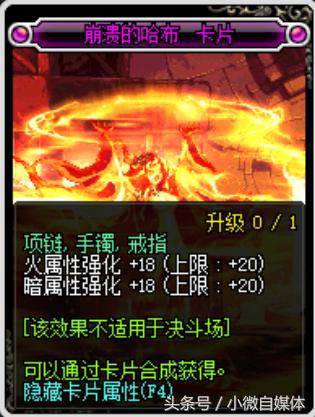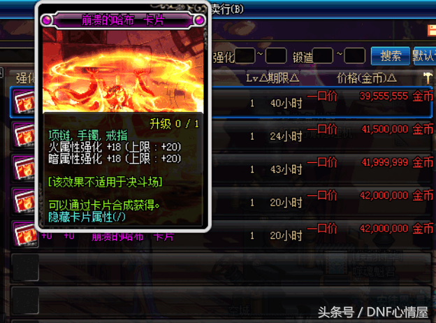 奔溃的哈布,这张卡片的原始属性是火暗属性强化18,但是能升级到20上限,不过这张卡片比较的便宜,在拍卖行只卖3900万左右。