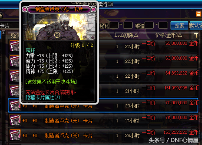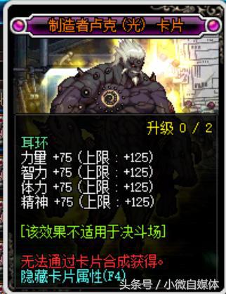 制造者卢克光卡,这张卡片在卢克中是唯一的一张传说卡片,而且属性比较的逆天,耳环附魔部位,四维属性加成75点,甚至能升级125四维耳环属性。在拍卖行这张卡片也不便宜,5500万游戏币,所以卢克团本中能翻到这张卡片,也是挺不错的。