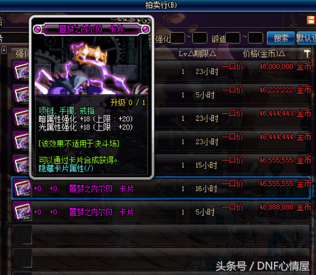 噩梦之内尔贝,光暗属性强化18,上限20的卡片,4600万游戏币,双属性中还是比较不错的卡片,价格也相对并不高。