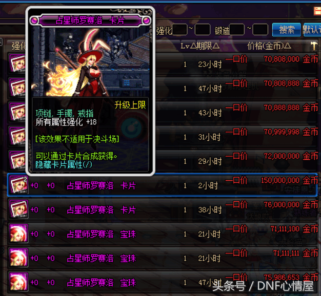 占星师罗赛洛,这张卡片属性比较逆天,所有属性强化+15,能升级到18点属性强化,这在拍卖行的价格比较昂贵,至少需要7000万游戏币,所以翻到这张卡片,就等于一夜暴富。