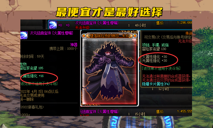 只要走3332散搭路线的玩家,基本上都和大幽魂有关系,如果大家选择走暗属性路线,就等于节省了一块辟邪玉或晶体契约,四舍五入就等于加强,所以到目前为止,“暗属性”就成为阿拉德最贵的属性!